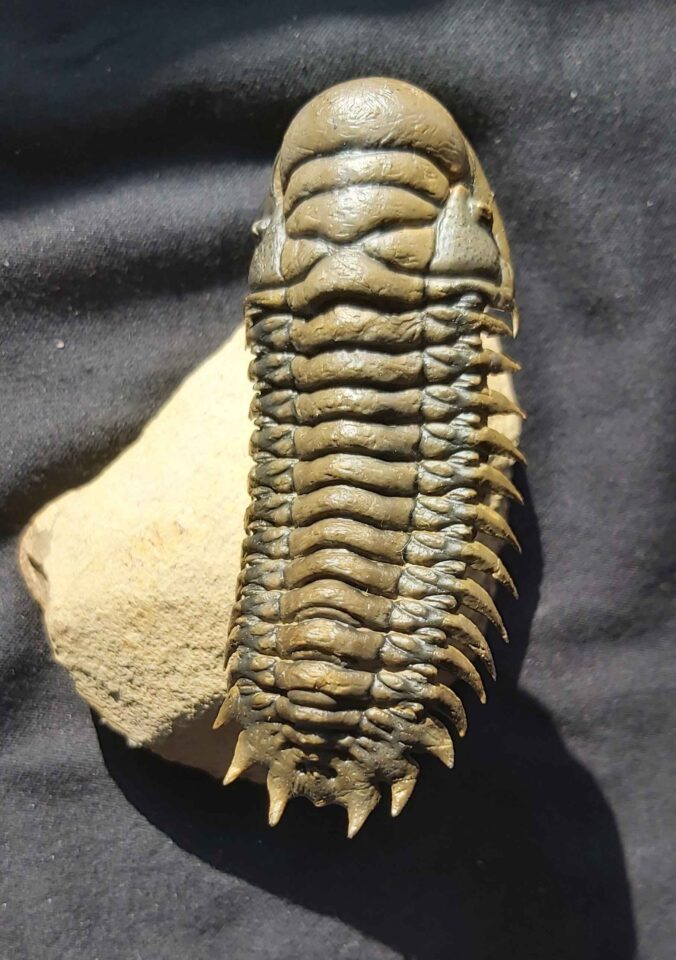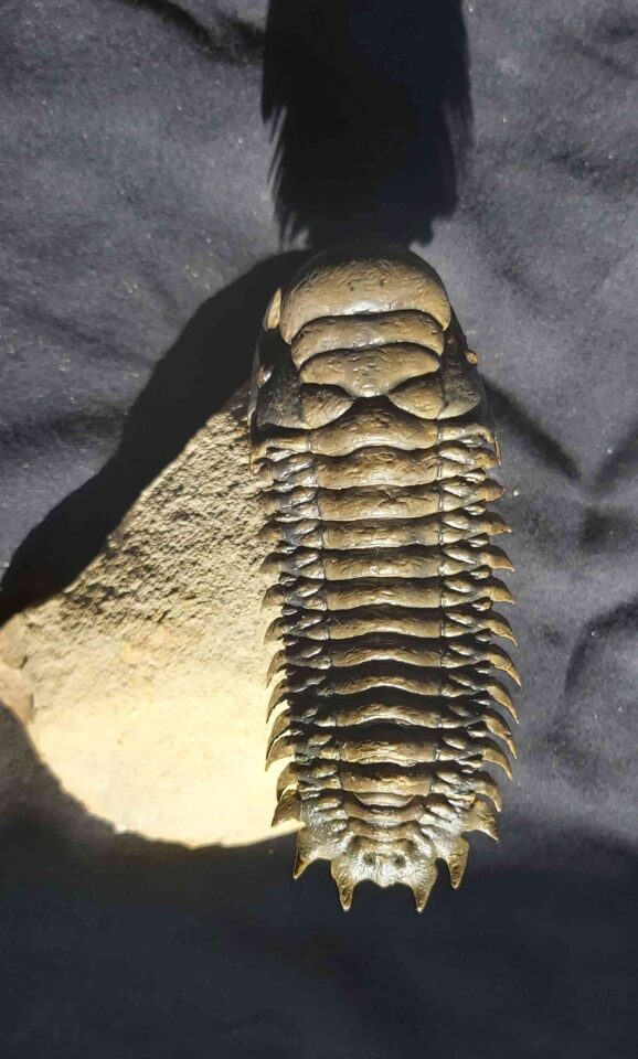 The Trilobite from Morocco measures 3.3 inches or 8.4 cm and is well preserved and prepared. Initial crack is from the right cephalon (head) side to the the left side in the neck area of the thorax.