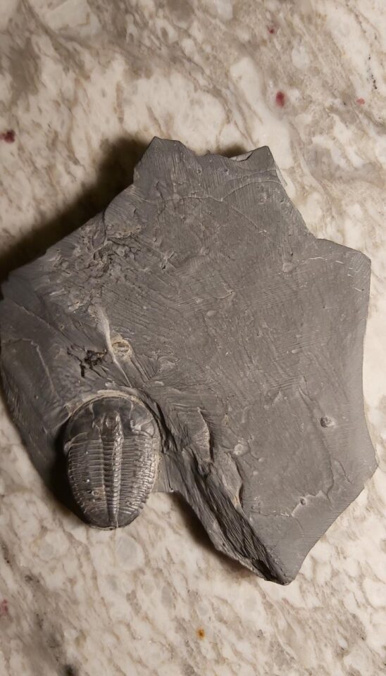 Elrathia kingii from Utah for sale. Nice preserved Elrathia kingii fossil on slab from the Middle Cambrian Wheeler Shale. The fossil is 1.4 inch or 3.5 cm long. The Age of the Wheeler Shale and the fossils found within is dated to about 507 million years ago. The fossil comes from the House Range of Antelope Springs, Millard County in Utah. The fossils of the Wheeler Shale are commercially quarried for the fossil and jewellery trade.