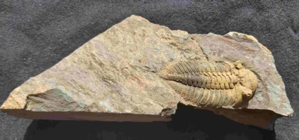 The Eodalmanitina macrophtalma Trilobite from France here is from head to tail tip 4.3 cm or 1.65 inches long. The only as imprint preseved tail spine is not included in the measurement. That would make it 5.8 cm or 2.25 inches long. There are no alternations on the fossil.