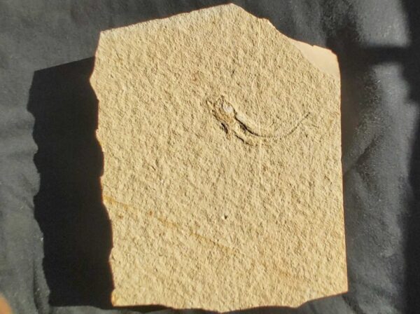 The small fish is 7 cm or 2.75 inches long. The slab is 16 cm or 6.25″ long and 13 cm or 5.1 inch wide. A nice small slab with well preserved fossil fish. Leptolepides sprattiformis.