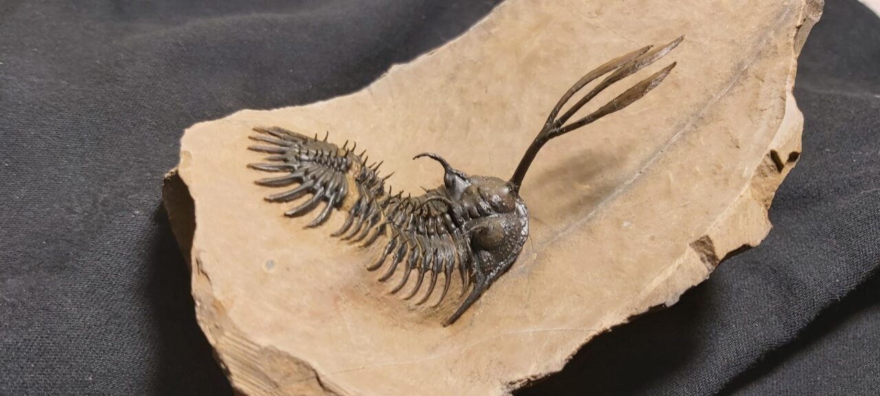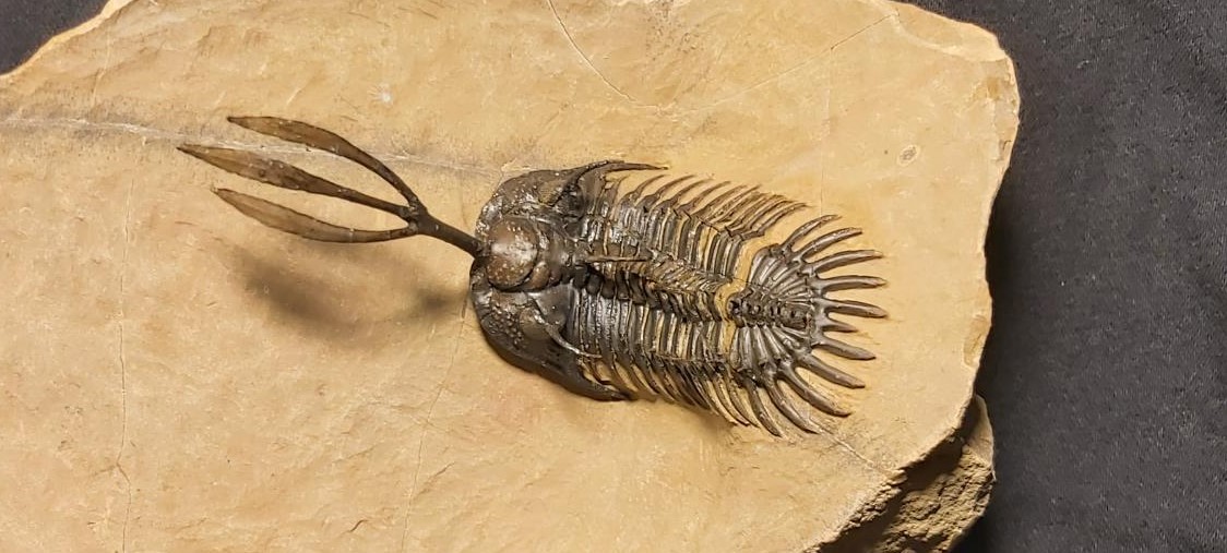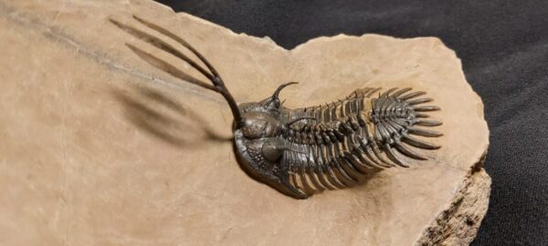 This Walliserops trifurcatus Trilobite for sale is an authentic fossil. The fossil measures 9 cm or 3.5″ from the front tip of the fork to the end of the tail.